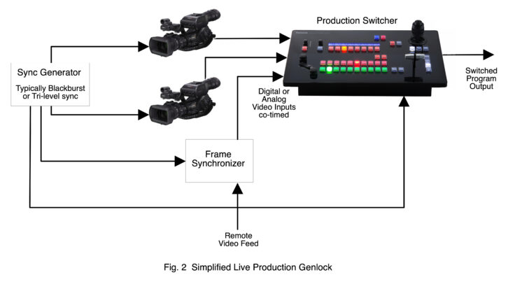 Digital video production switchers generally allow a greater range of input timing, but non-synchronous (unlocked) sources can still produce glitches, such as the picture offset vertically in the frame. Some readers may not even know that this can happen because many switchers now include internal frame synchronizers (on each input or assignable) that compensate for non-sync inputs. This is quite handy, but the price paid is a frame of video delay for any source using a frame sync. That’s one reason it is still useful to genlock sources when possible (Fig. 2).