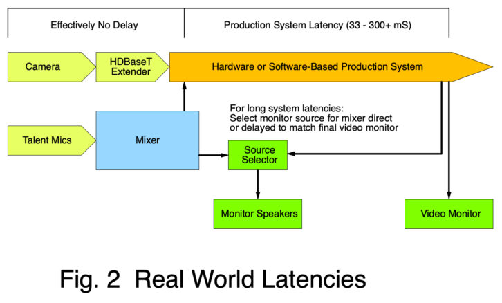 An important point about latency, of course, is that something can only be “late” in relation to something else. That 12-frame delay won’t matter to a stream viewer at home, since there is nothing to compare with (and the stream is likely 20-30 seconds behind real time anyway). But that much delay could be a problem for other uses, such as feeding the program back to a remote guest. And if audio is monitored ahead of the production switcher, the apparent lip-sync will be way off.