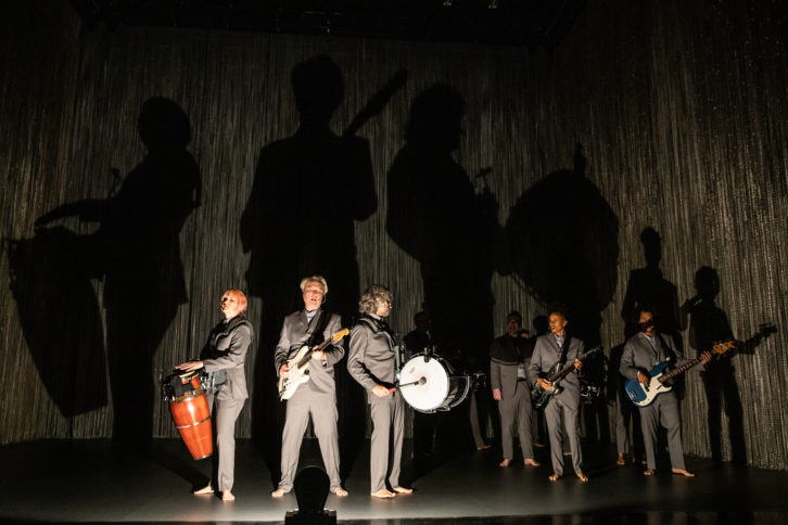 Visually and aurally, American Utopia is atypical of Broadway. There is no set, and for music there is no isolated “pit” band relying on click tracks and pre-records. Instead, all music is played live on the stage by an ensemble (including Byrne) of twelve musicians/ vocalists, with six on percussion and all twelve on vocal mics. Everybody is completely mobile using wireless connectivity, allowing for a freeform choreography that blends the fluid movements of Brazilian percussion ensembles with the disciplined formations of American marching bands.