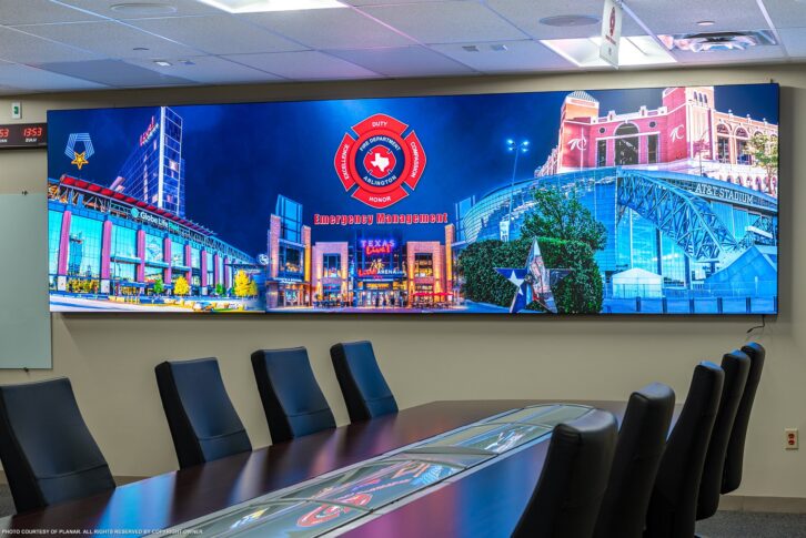 Arlington’s emergency resources are coordinated in collaboration with public and private partners from the Emergency Operations Center (EOC). Located in the OTT Cribbs Public Safety Center, the EOC is activated in response to large special events, natural disasters, and man-made emergencies. These can include floods, tornadoes, hurricanes, civil unrest, public health emergencies, and sporting-related events. To improve their monitoring and response capabilities and make use of the latest tools that are available, Arlington engaged control room designer Activu to perform a comprehensive technology upgrade of the EOC, leading to the integration of a nearly 16-foot-wide, 4.5-foot-high (8×4) Planar DirectLight Ultra Series MicroLED video wall with a 0.6mm pixel pitch (DLU0.6).