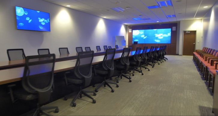 In the Emergency Operations Center, an 2×3 video wall composed of LG VMC5 series 55” Video wall monitors and Extron Quantum Connect video processors ensures that anytime an emergency arises, the Corps is prepared to assess and assist in the situation. Video signal is distributed by a Crestron Digital Media switcher and endpoints while audio is handled by Shure Microflex wireless mics and Audix wired microphones feeding a Biamp Tesira Server-IO and amplified by Extron XPA series amps.