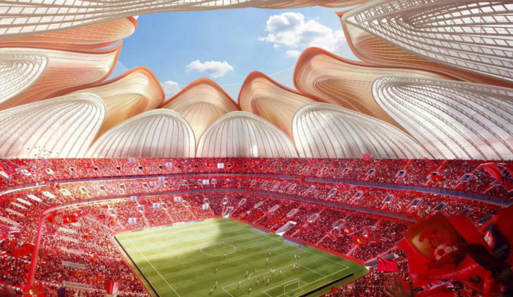 At a time when sports venues around the world are closed, construction is underway on the biggest stadium for soccer in the world–a $1.7 billion lotus-shaped home for China’s champion soccer team-Guangzhou Evergrande. It will have a seating capacity of 100,000 and a floor area of 150,000 square meters (1.6 million square feet). It will be the fourth largest sports venue in the world.