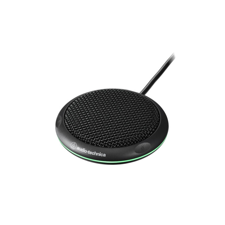 Simple and flexible conference table mic mounting is possible with the Audio-Technica ES964 compact boundary microphone array and its low-profile design. Varying polar patterns are configurable through a mix among its single omnidirectional capsule and two bidirectional capsules. Three separate remote buttons on the mic touch controls can be used by various participants to mute audio or trigger a logic point. The ON/OFF/MUTE condition is LED indicated.