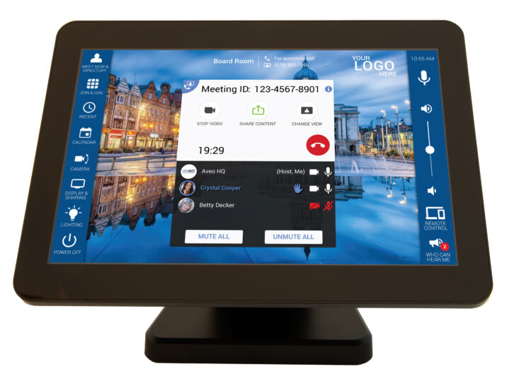 One of the largest conference system touch panels is the 10in. diagonal Aveo Systems Mira Connect 10, which is designed to operate the Mira Connect control system and can be mounted on a table stand, in/on-wall, and fitted with side LED bars. The bar is light red when the system is muted and green while in a call. The panel can be used to operate Zoom Rooms, Poly, and Cisco videoconferencing equipment.