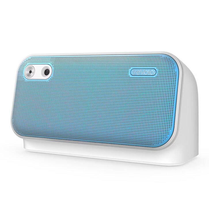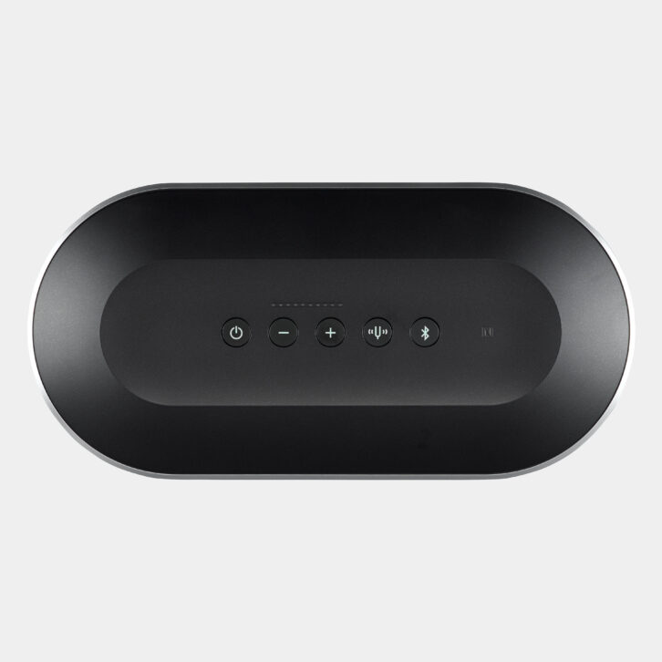 The BenQ treVolo U dialog speaker is a small desktop unit that contains a separate HF tweeter, mid-range woofer, and a passive bass radiator. Speech is picked up by an electret condenser mic mounted with a parabolic design receptor. These are integrated to the front of the device, which is angled up at 12 degrees and equipped with acoustic echo cancellation. Top buttons can control power, volume, input, Bluetooth range, output level, and charging.