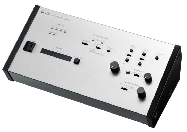 The TOA TS-910 central unit can be connected to a combination of up to 192 wired and wireless discussion units for a hybrid design suited to the facility. This would be a lot to handle, but the TS-910 also features a feedback suppressor (FBS) function along with external control, voting result confirmation, and equipment installation confirmation through a connected computer. It is tabletop or rack-mounted and provides two-channel audio for base language and translation.