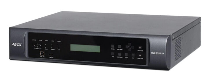 A 120-watt Crown DriveCore amplifier, audio processing, and feedback suppression are featured in the AMX DVX-2265-4K presentation switcher. The IN/OUT audio interface includes Dante and analog, while DXLink provides compatibility with other AMX units and standard HDBaseT devices. Outboard control capability extends to the HTML5 Web Interface with built-in status and troubleshooting features