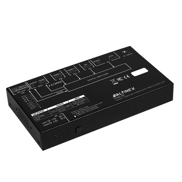 The versatile Altinex UT260-102 can switch among HDMI, VGA, and Display Port in auto-switch mode or by remote contact closure and RS-232. Its HDMI output also provides deembedded analog sound. The most recent source input can be automatically switched to the output, a feature especially useful in classroom environments. LED driver connections allow remote input indication, and the RS-232 interface can also be used for configuration.