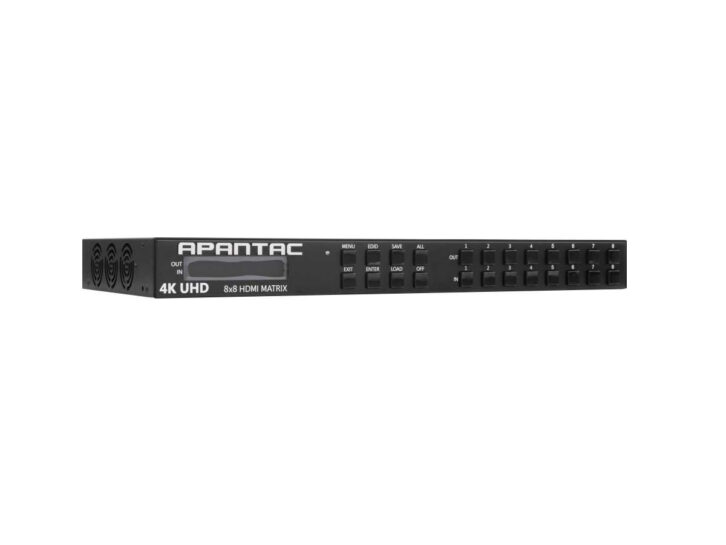 Equally at home in a single rack space or on a shelf, the Apantac Mt Hood HDM2.0-8×8-UHD-A matrix switcher with audio breakout handles resolutions up to UHD@60Hz (4:4:4) and offers four presets. There is an LCD module on the front panel for control, but in addition, there is a LAN port and RS-232 serial control capability. On the back are stereo and optical audio breakout ports
