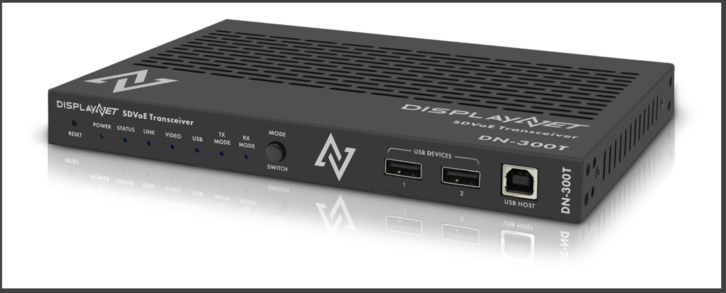The 1RU fanless DVIGear DisplayNet DN-300T utilizes SDVoE ASIC technology to offer simultaneous TX/RX operation. Like all DisplayNet products, it provides 4K/60 (4:4:4) video distribution with limitless scalability, zero-frame latency, and zero image artifacts. The new DN-300T is a fully bidirectional Transceiver. This single unit can simultaneously send and receive AVoIP data. It also offers dedicated TX and RX modes. Fully compatible with all DN-300 Series models, with features including PoE+ support, and dual (copper/fiber) network interfaces for distances of up to 100 meters (328 ft.) with CAT-6A twisted pair and up to 30 KM (18.6 miles) with single-mode fiber. The unit includes auxiliary H.264/5 video output streams that provide support for viewing source thumbnails and for remote viewing/recording with resolutions up to 1080/30p.