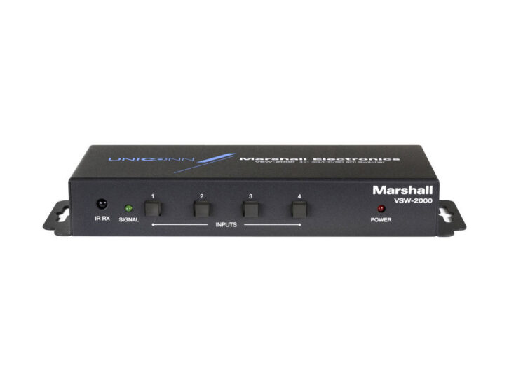 Whether working as a sub-switcher in a larger system or operating on its own, the Marshall Electronics VSW2000 allows selection between four 3G/HD/HD-SDI input formats to an SDI switched output. While taking up a small shelf/ rack space, or being mounted under a desktop, this tiny unit can be operated via the front panel buttons or remotely controlled through IR remote or on a 9-pin serial terminal. Stable output is assured through re-clocking and equalization on the outputs.