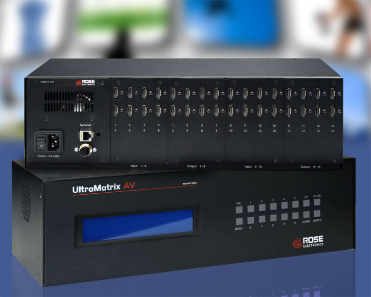 A reliable and proven 16×16 matrix system for 1080p signals is the Rose Electronics UltraMatrix AV HDMI, also supporting 7.1 digital multi-channel audio. Among the features is Learn Mode which inputs EDID information from any output display and remembers it. The 3RU device can be controlled via front panel, remote matrix switching software, optional IR controller, or serial connection. One variant includes a LAN card for TCP/IP operation.