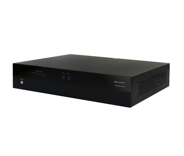 The Snap One Binary B-520-MTRX-230-8×8 has simultaneous HDMI and HDBaseT outputs for local displays and signal reach as far as 230ft. with bi-directional IR control. Receivers can be powered from the switcher through powerover-cable (POC) and there is Ethernet, RS-232 control, and IR routing with shielded Cat5e/6 cable recommended. The 520 Series is certified for compatibility with Control4 automation and networking.