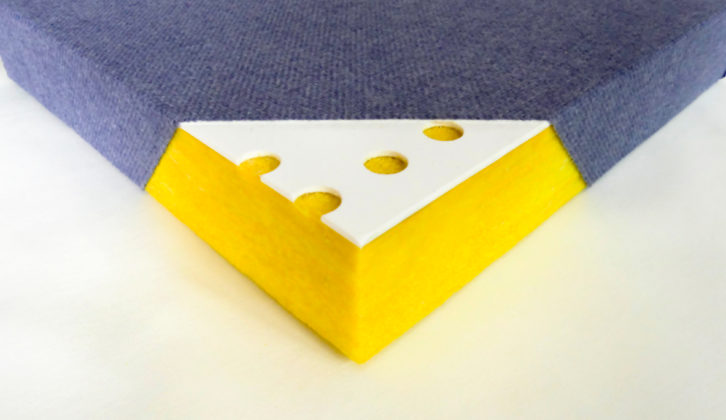 Composed as a mixture of basalt rock and slag steel microfilaments pressed into sheets, the Evolution Series acoustic panels from Prosocoustic are covered in a polyester blend acoustic grade fabric (acoustic suede is available) and they have an aluminum exoskeleton frame attachment system. Each panel can be configured as a dipole or single sided absorber and they are configurable into gobo arrays, ceiling clouds, hanging baffles, microphone booths and isolation cabinets. The Evolution panels can be purchased in a wide range of colors.