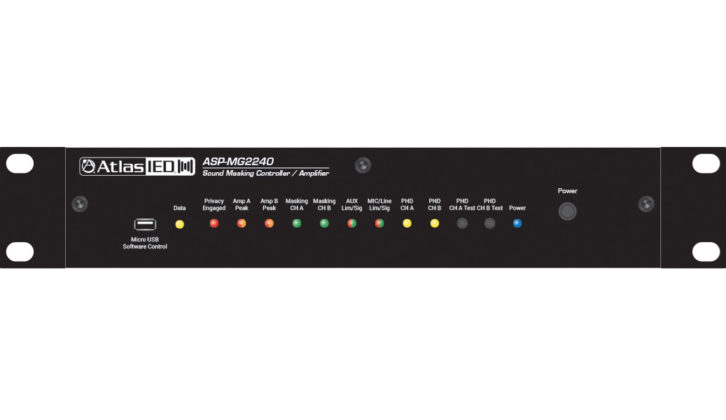Atlas IED has a completely self-contained two-zone sound masking controller in the ASP-MG2240 with its two 20-watt 70.7V amplifiers including control software, separate analog masking generators with EQ, 24/7 scheduler, balanced mic/line input, auxiliary input for background and audio line output. All of the settings for these can be stored in the unit or in a separate PC as a configuration file. Equipped with internal DSP, it can cover an area of up to 7000 square feet or two zones each up to 3500 square feet. Customizable speech privacy enhancement can be turned on when needed along with paging and background audio. The sound inputs have selectable 5-band EQ and high/low pass filters to work with a hi Q feedback filter and audio output limiters.