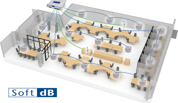 SmartSMS-NET from Soft dB is a sound masking system featuring an automatic 240 narrow band equalization process along with a continuously adjusted masking sound level based on ambient noise measurement. It is a networked system that can control large and small masking zones. An adaptive sensor measures the acoustic response and background noise of each work space. Then a specific masking noise that is most effective for this area is generated and transmitted. The masking level is automatically adjusted in response to noise levels. The system is able to adapt its response to suit either open plan or private office spaces, delivering more speech privacy and with the smartphone application, end users can adjust the volume of the masking sound and music for their zone.