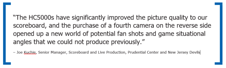 Prudential Center, the world-class sports and entertainment venue located in downtown Newark, NJ, is recognized as one of the premier venues in the United States and hosts over two million guests annually. Home to the NHL’s New Jersey Devils and NCAA’s Seton Hall Pirates men’s basketball team, Prudential Center has supported video board production with Panasonic broadcast cameras since its opening in 2007. By last year, new cameras were required to support in-game presentation on the arena’s massive, center-hung LED scoreboards (almost four stories tall). Concurrently, the Prudential Center’s Content Production Department decided to upgrade to 4K production of content that is seen nationally and regionally on the NHL and MSG networks.