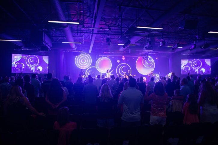 The PA system includes three CDD-LIVE 12 flown left, center and right over the front edge of the stage with three more CDD-LIVE 12 halfway back over the congregation for delays. Two CSX-LIVE 218 subs are flown over the stage in the ceiling behind and above the CCD-LIVE 12.