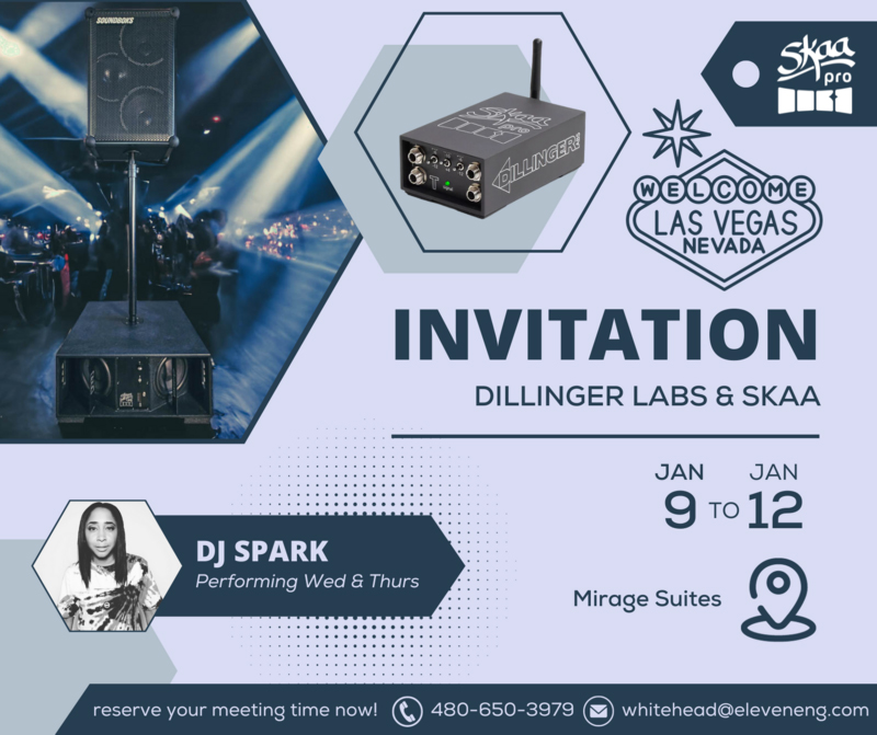 During the event, company representatives will be on hand to showcase additional HiFi, wireless SKAA-enabled speakers, subwoofers, headphones, and standalone professional transmitters/receivers, as well. DJ Spark will also be performing Jan. 10-11 in the Dillinger Labs suite (TBD).