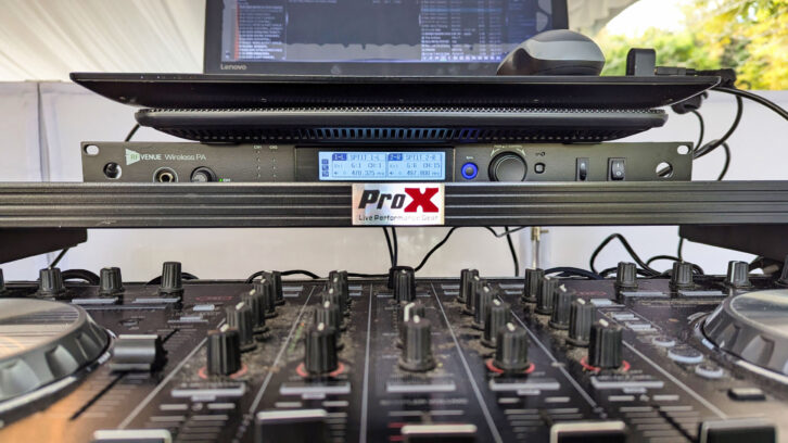 Photo caption: RF Venue’s RF PA Extension Kit transmitter incorporated into a DJ Ra-Mu and the Crew wedding setup