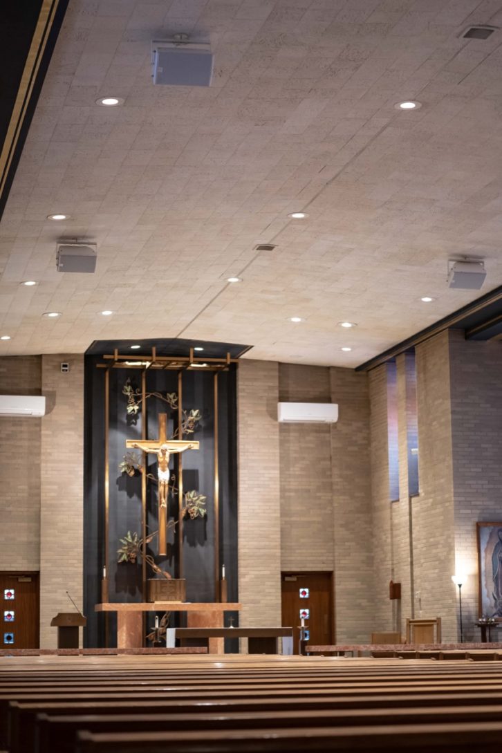 The system also includes a BSS processor as console with is controlled through an easy to use iPad interface for the priests. DPA lapel mics are used with Shure QLXD wireless systems.