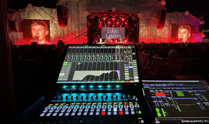 Lukas Graham is a two-piece comprising lead vocalist Lukas Forchhammer and drummer Mark Falgren that is supplemented on stage with additional musicians and backing tracks. Because the show is timecode-based, Grønbæk says, “I have snapshot automation. The incoming timecode is triggering different snapshots.” When playing festivals or fly-dates where there may not be enough time to optimize the P.A. rig before the band take the stage, Grønbæk has the timecode triggering a variety of snapshots — adjusting channel mutes, controlling auxiliary sends or making delay and reverb changes — during the first few songs so that he can make fader moves with one hand while trimming the speaker system with his other hand on a separate touchscreen.