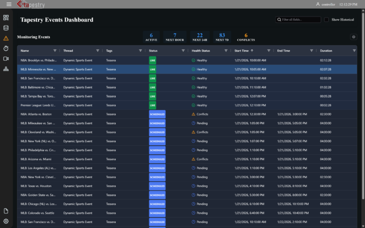 Tapestry enables real-time, event-aware automation such as signal routing, service provisioning and deprovisioning, and cloud resource optimization. This helps broadcasters ensure seamless content delivery, reduce operational costs, eliminate redundant steps, and avoid paying for infrastructure when it is not in use. The platform also improves reliability and resilience by providing clear visibility into live workflows and allowing changes to be made dynamically during an event when conditions inevitably change.